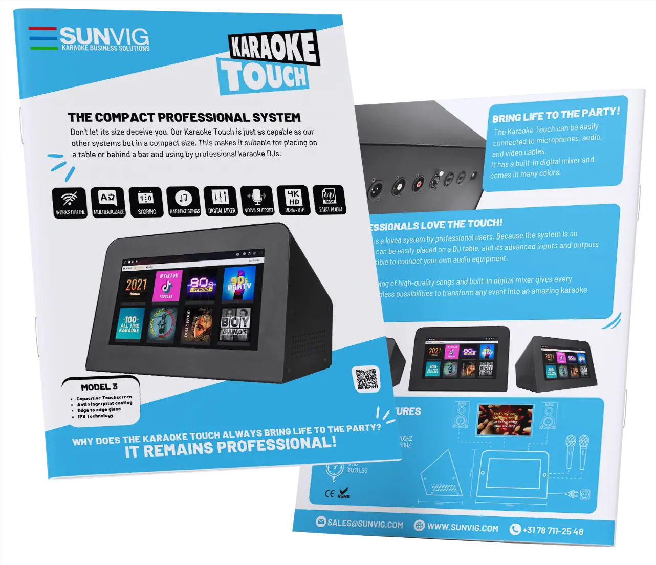 Muziek brengt het feestje tot leven. Dus of u nu een evenement organiseert, optreedt als DJ of apparatuur verhuurt, de SUNVIG Event Solution zal uw bezoekers omver blazen. Uitgerust met innovatieve software en een uitgebruide liedjescatalogus in diverse talen is de SUNVIG Touch de perfecte match voor uw event. Koppel het aan uw audio-apparatuur en het feestje kan beginnen!